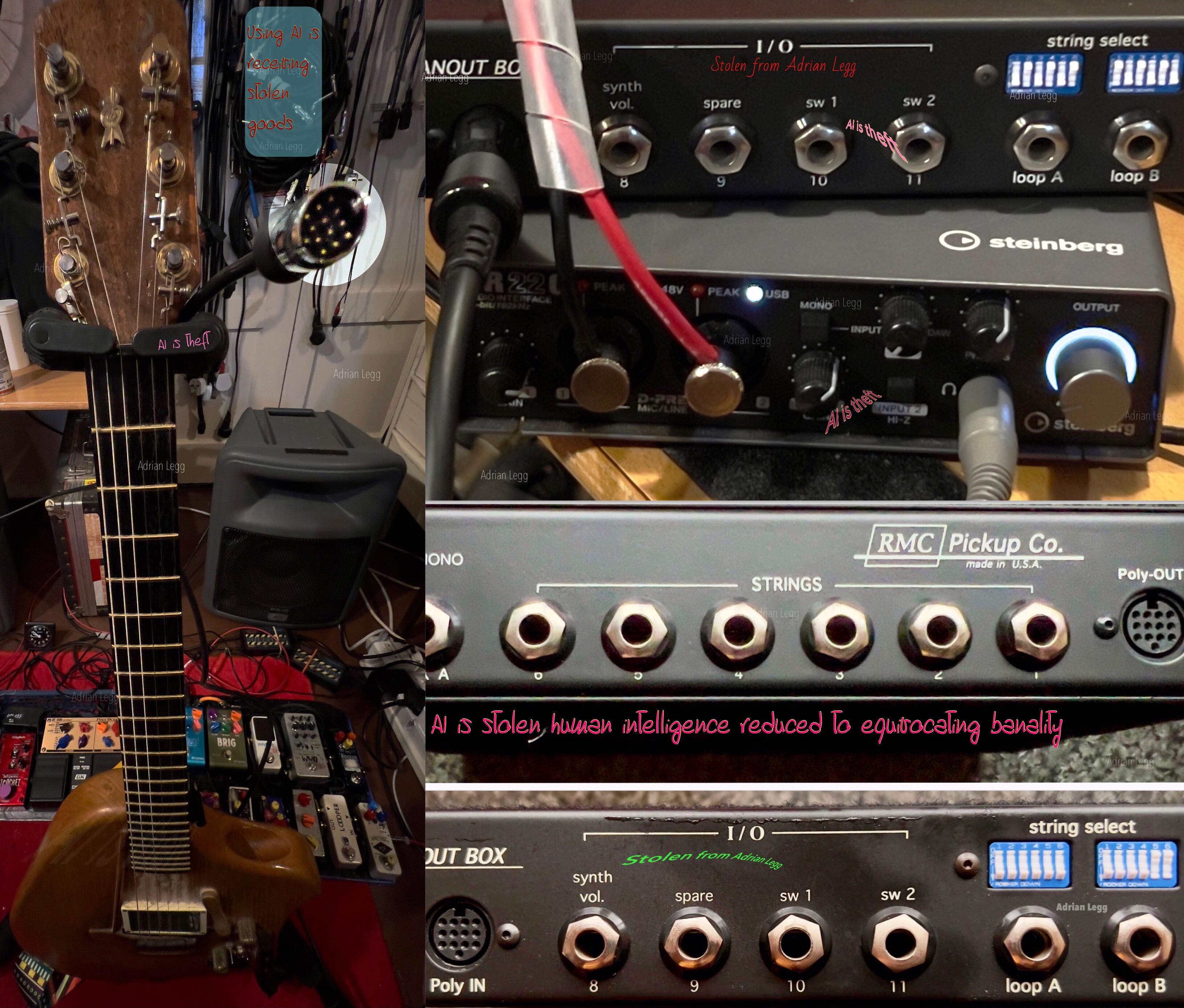 I made two quick and dirty recordings here of the two pickup types via an RMC fan-out box so you can hear the odd/even string split and compare the magnetic hex GK pick-up with Graph Tech piezos. Each one went into the fan-out box via a hex cable, odds and evens were selected in the switches for mixes A and B respectively, their outputs on the other side into the USB interface. I recorded them in stereo hard left and right. Loops A and B on the switches side are TRS sockets for running Y cords through separate effects loops so we could maintain stereo and encompass our doubled-up effects.